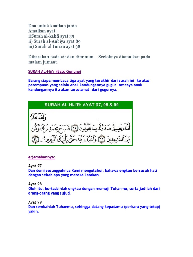 1Membaca surah Al-Hijr ayat 97 98 dan 99. Ada banyak macam makanan yang dapat memperkuat kandungan. Ada beberapa doa zikir yang boleh diamalkan bagi tujuan ini.